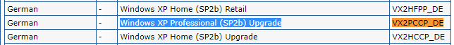 | Windows XP Professional (SP2b) Upgrade | TFGK8-RQT7R-F6KW8-Q2X4M-YF2CX |